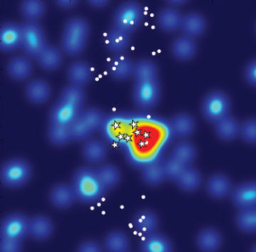 PRISTINE PART? Colors from blue to red mark increasing density of stars in a newly discovered dwarf galaxy, Andromeda XII. White stars indicate confirmed members of the dwarf, which appears to be on its maiden journey into the Local Group of galaxies (to see a video simulation of in-falling galaxies, click here). |