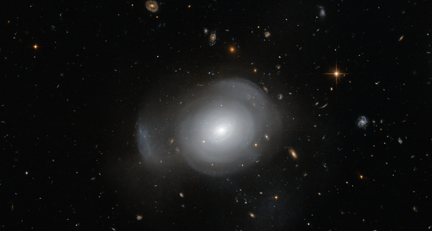 GETTING SLAMMED The concentric shells of PGC 6240 (shown) and the young star clusters that orbit it may have formed when the galaxy smashed into another one.