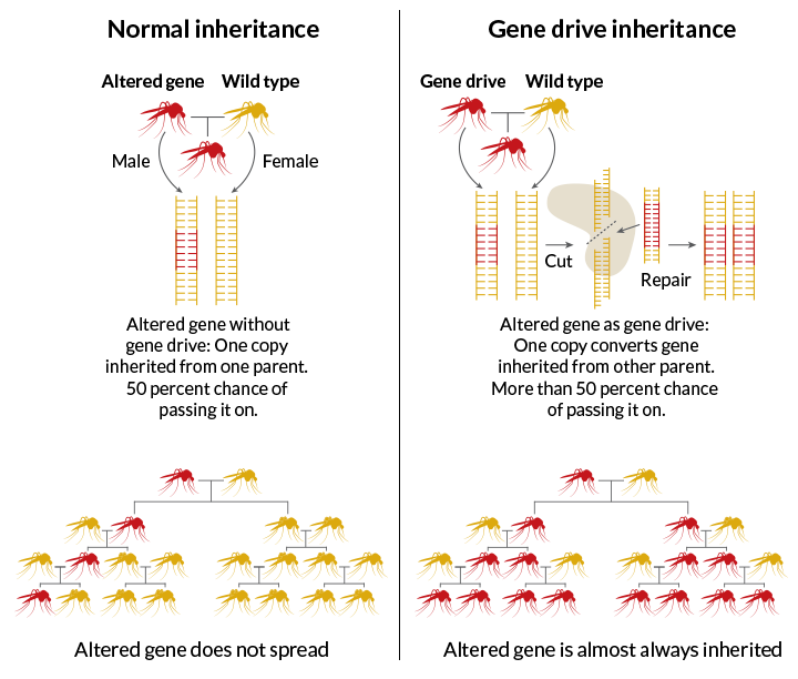 This approach has special appeal for weakening the disease-carrying dexterity of mosquitoes. A gene drive carried by 1 percent of mosquitoes in a population can be inherited so efficiently that in about 20 generations, 99 percent of all the mosquitoes will carry it, Burt calculates.