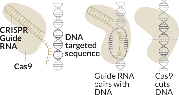 CRISPR/Cas9 is a tool for editing genes. A guide RNA shepherds the Cas9 enzyme to a specific stretch of DNA. Cas9 then cleaves the DNA to disable or repair a gene.