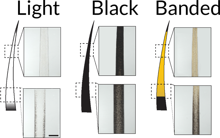 In the new study, evolutionary developmental biologist Ricardo Mallarino of Harvard University and colleagues examined the multicolored stripes of African striped mice (Rhabdomys pumilio). Two light-colored stripes, each flanked by black stripes, run down the mice’s backs. A strip of fur the same brownish color as most of the rest of the body separates the dark-light-dark striping. The patterns are created by three types of hair: Hairs with banded yellow shafts growing from a black base populate the strip in the middle, while completely black hairs from base to tip are found in the black stripes. Hairs with a black base but no pigment in the shaft make up the light stripes.