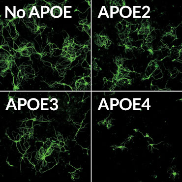 For more than 20 years, researchers have known that people who carry the E4 version of the APOE gene are at increased risk of developing Alzheimer’s. A version of the gene called APOE3 has no effect on Alzheimer’s risk, whereas the APOE2 version protects against the disease. Molecular details for how APOE protein, which helps clear cholesterol from the body, affects brain cells are not understood.
