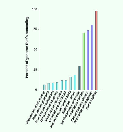 While the number of genes isn’t much different in roundworms and people, the human genome is 30 times the size of the roundworms’. People have a much larger quantity of DNA beyond what codes for proteins. Since much of this “junk” DNA is being transcribed into RNA, perhaps it’s responsible for much of the complexity of human bodies and brains. In fact, organisms simpler than roundworms, such as single-celled bacteria, carry little noncoding DNA and may have no regulatory RNA at all.