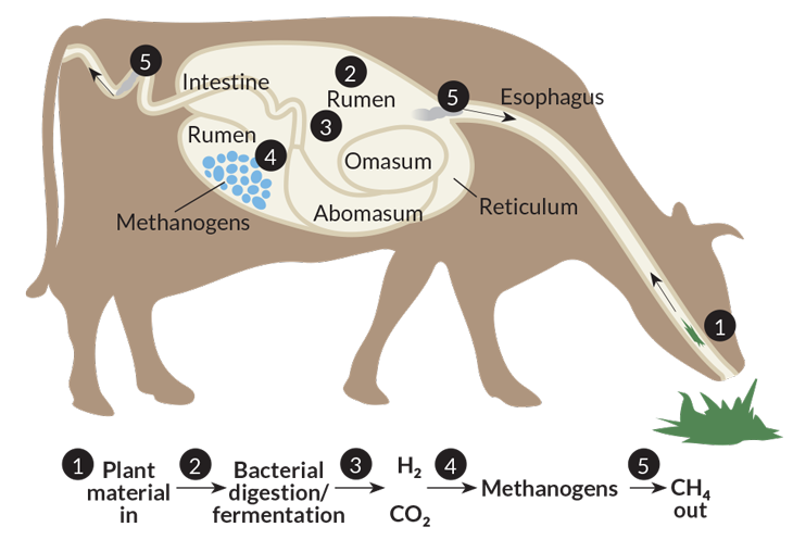 But a ruminant animal’s microorganisms can extract the energy locked up in cellulose. Its digestive system includes microbes called methanogens, ancient entities distinct from bacteria and other microorganisms. Methanogens can live in other oxygen-starved environments, such as the bottom of lakes. When microbes in the rumen digest cellulose, they leave behind nutrients that the cow needs plus methane gas, created when methanogens soak up the hydrogen left over from fermentation. The relationship is straightforward: The more the cow eats, the more it ferments, the more methane produced.