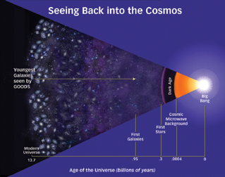 COSMIC TIMELINE. Observatories are peering far back in time to study the evolution of stars and galaxies. As part of a survey called GOODS, the Hubble Space Telescope’s Advanced Camera for Surveys and the Chandra X-ray Observatory are searching the same part of the sky for some of the first galaxies. |
