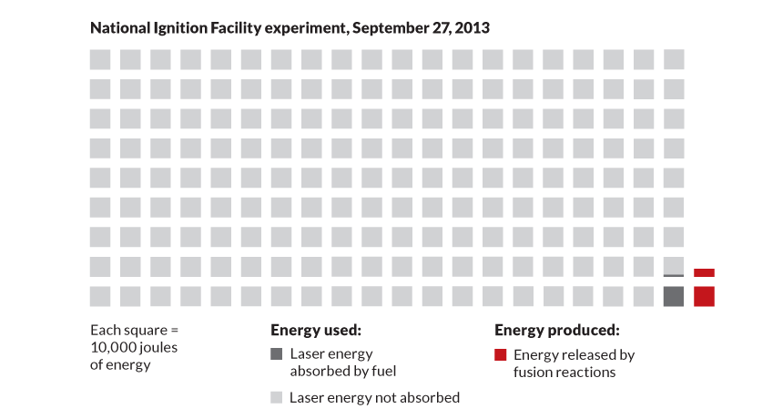 During the 160 trillionths of a second of sufficient pressure and temperature, about 5,100 trillion fusion reactions took place. The reactions produced 14,000 joules — more energy than the fuel absorbed. That’s a first for any laser fusion experiment. However, it’s well short of compensating for the 1.8 million joules from the laser. It’s analogous to making a solid return in the stock market, but only after the broker took a commission of more than 99 percent of the initial investment. “It sounds very modest and it is, but it’s closer than anyone has gotten before,” Hurricane says. “That’s a major turning point in a lot of our minds.”
