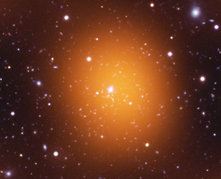 It’s bright, too: The galactic conglomerate is the most luminous cluster ever observed in the X-ray spectrum. At its center lies a galaxy 50 times larger than the Milky Way. “It’s kind of the boss galaxy,” McDonald says.