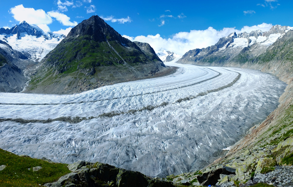 NATURE’S CARVER Glaciers such as Switzerland’s Aletsch Glacier (shown) pave the way for more extensive glaciations in the future by eroding wide, flat valleys into mountain landscapes. Jean Braun