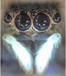 The female of the species doesn’t have the same UV-reflecting patches, but her palps fluoresce when exposed to UV. That is, they absorb the energy of sunlight’s UV wavelengths and give off a greenish glow.