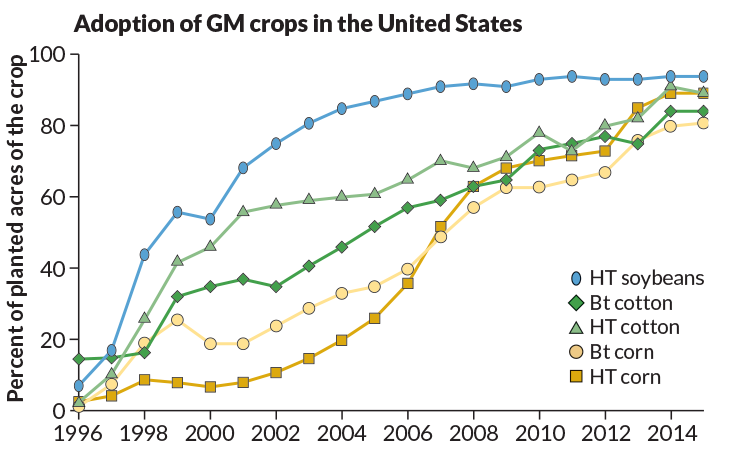 Engineered crops typically have traits that help farmers tackle very old foes. Weeds are one such headache, and they were among the earliest targets of genetic engineers. While chemical weed killers were in use before the advent of GM crops, the use of the herbicide glyphosate, marketed as Roundup, has skyrocketed since the introduction in the 1990s of crops engineered to withstand it. Glyphosate meddles with an essential plant enzyme; the engineered crops have a bacterial version of the enzyme, so the plants persist while neighboring weeds perish. “Roundup ready” plants, which now dominate U.S. fields, include soybeans, corn, canola, cotton and sugar beets.