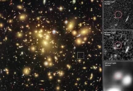 The cluster’s gravity distorts images of background galaxies, bending them into arcs and magnifying their brightness. One of these galaxies proved especially intriguing because it appeared bright at several infrared wavelengths recorded by Hubble but disappeared in visible light.