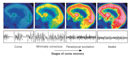Schiff sees similar patterns of temporary excitability in some brain-injured patients. Those who are “minimally conscious” — meaning they show only occasional awareness of themselves and their surroundings — can respond to low doses of sedative drugs by waking up. Here, the anesthetic drugs “kick-start” the brain, helping it to turn itself back on.