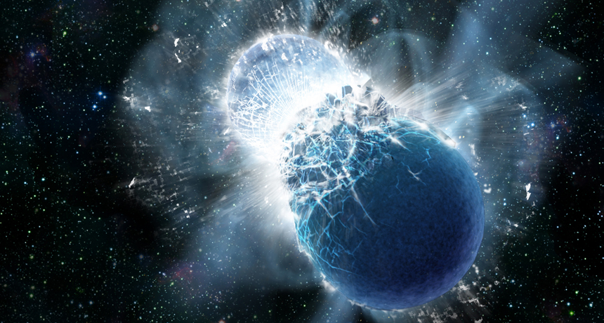 GOLD EXPLOSION New observations suggest that colliding neutron stars (shown in this artist's conception) produce short gamma-ray bursts. Such collisions also eject material that may be the source of the universe's gold and other heavy elements.