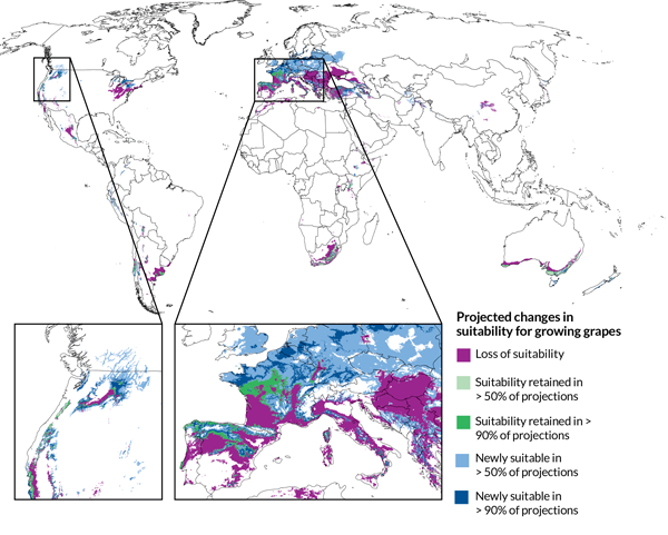Their study, published last April in the Proceedings of the National Academy of Sciences, showed that some of the best places to grow wine grapes in 2050 will overlap with panda habitat in China, as well as regions north of Yellowstone National Park where land is being set aside for bears, antelope, mountain lions and other species.