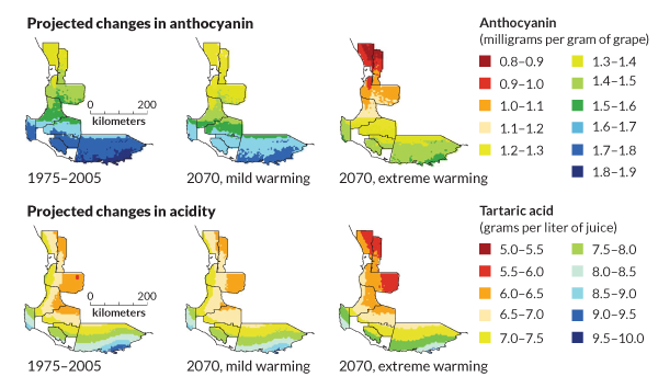 That’s why some famed regions are in danger of extinction. Before the end of the century, for instance, Western Australia may no longer be known for its cabernet sauvignon or shiraz. Using climate simulations, Australian researchers found that by 2070, the acidity and concentration of a compound that gives red wine its color could dip below thresholds needed to maintain high-quality wine. The team reported the bad news in September in the International Journal of Biometeorology.
