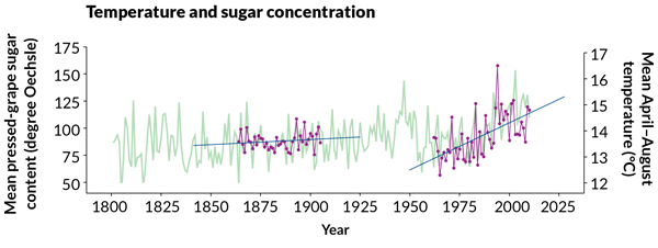 Wine growers have already started to see sweeter grapes and higher alcohol levels. In Germany’s Franconia region, the sugar content of pressed grape juice that’s used to make wine rose some 20 grams per liter each decade from 1962 to 2010, researchers reported July 23 in PLOS ONE. The team concluded that changes in growing-season temperature account for more than 40 percent of the increase.