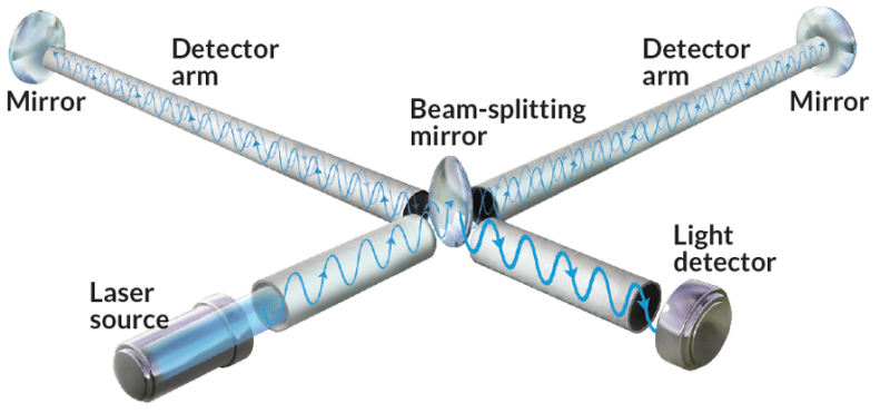 The experiment is designed so that, in normal conditions, the light waves cancel one another out when they recombine, sending no light signal to the nearby detector.