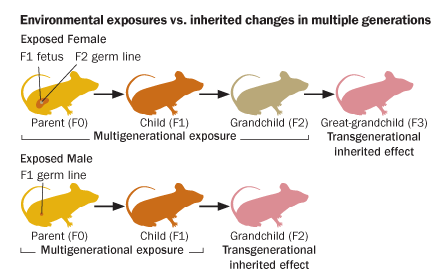 Now, animal studies and a smattering of human data suggest such prenatal effects could reach farther down the family tree: The vices, virtues, inadvertent actions and accidental exposures of a pregnant mother may pose health consequences for her grandchildren and great-grandchildren, and perhaps even their offspring.