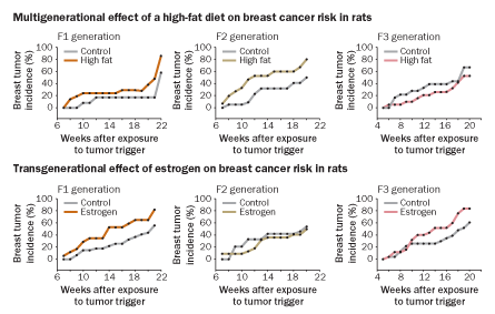 Pregnant rats on a high-fat diet had daughters and granddaughters that were more susceptible to developing mammary tumors when encountering a cancer-causing chemical later in life, the researchers reported last September in Nature Communications. But great-granddaughters were not at increased risk, indicating that when high-fat diets alter breast cancer susceptibility it is not a permanent, inherited change, says Hilakivi-Clarke.