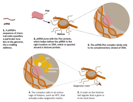 Scientists are uncovering molecular details about how piRNAs put genes on lock-down. Because RNA is genetic material, it can match up to specific sequences of DNA letters. A cell may contain hundreds of thousands of piRNAs, each with a unique combination of 24 to 32 RNA units, or nucleotides, says Haifan Lin, a stem cell biologist at Yale University. The piRNA’s sequence is like an address on a letter specifying where a protein called Piwi should recruit proteins that make epigenetic modifications, Lin and colleagues reported in the March 11 Developmental Cell. In the fruit flies Lin studies, as in worms, the modifier proteins stick methyl groups onto histones. But Lin thinks piRNAs may similarly direct DNA methylation enzymes in mammals, including humans.