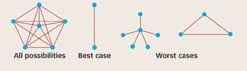 Guessing a pair of secrets can be visualized in terms of an array of points and lines, an array that mathematicians describe as a graph. Each point represents a potential answer, and a line links each pair. The player zeroes in on the pair of secrets by asking yes-or-no questions. Each answer may eliminate certain lines from further consideration. In the best case, the result is two points connected by a line. In the worst possible case, however, a player may be left with a triangle of three potential secrets or a star made up of several possible secrets. In neither of these instances is it possible for the player to identify both secrets.–I.P.