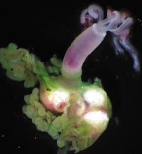 The males play out an entirely different nutritional tale. More than 100 tiny males can live inside the sheath that surrounds the female’s elongated body. The males don’t appear to be parasitic and probably feed off yolk left over from early development. Vrijenhoek rates the males as “little more than larvae.”
