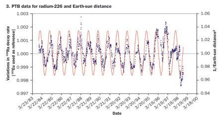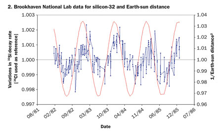 In a separate paper, also posted online in August, Fischbach, Jenkins and their collaborators compared puzzling and still unexplained results from two separate experiments from the 1980s—one on silicon-32 at the Brookhaven National Laboratory in Upton, N.Y., and the other on radium-226 done at the PTB, an institute that sets measurement standards for the German federal government. Both experiments had lasted several years, and both had seen seasonal variations of a few tenths of a percent in the decay rates of the respective isotopes.