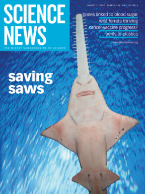 McDavitt’s probes showed, however, that the biggest sawfish market by far is for fins that go into soup. Although the sawfish is not a true shark, its fins are used in the same way as sharks’ are for shark-fin soup. After many hours of simmering, long cartilage needles, known as ceratrotrichia, turn into the gel-like noodles that characterize shark-fin soup, a long-revered food in some cultures (SN: 10/12/02, p. 232). In fact, people value sawfish fins so much as a dense source of ceratrotrichia that the fish’s fins are among the priciest, at up to $550 per pound.