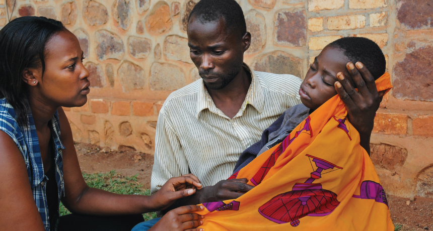 HOPEFUL HELP A psychosocial worker in Burundi in 2005 assists a boy with epilepsy and his father with mental health and epilepsy treatment.