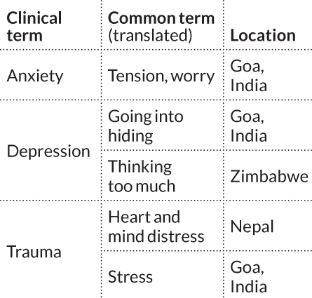 Patients in Goa often speak of anxiety problems as “tension” or “worry,” and describe depression as “going into hiding.” Health counselors use those terms to inquire further about a person’s daily problems and to develop a treatment plan.
