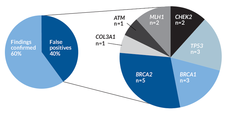 “To say there are 40 percent false positives may dissuade people — people who are really carrying mutations — from having these things clinically checked out,” Lennon says. These people might think their result is also a false positive. “That kind of blanket message is a huge disservice to people who might otherwise have actually gone in and gotten confirmatory screening.”