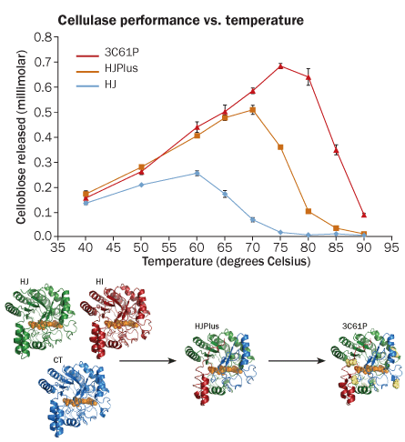 After a recent cellulase “breeding,” Arnold’s team reported making new enzymes that could work at about 70° C. Some of the parent enzymes could break down cellulose only at temperatures around 57° C. Since that report, Arnold has been able to coax more proteins to work at similar temperatures.