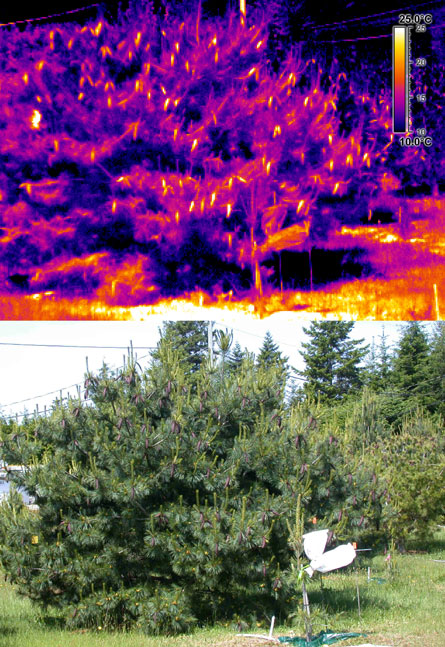 “We went out with the Thermovision camera and we were just stunned,” says Takács. Seen through the infrared camera, the orchard of conifers lit up, as if the trees were decked out with candles. “All we could think of was Christmas,” he says.