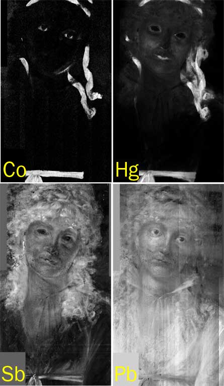 The analysis revealed that the painting now known as “Pauline in a white dress” emerged after substantial changes. The presence of cobalt indicated that blue pigment was used in the woman’s purple hair ribbons, and the orange-red pigment vermilion was indicated by mercury. The presence and distribution of antimony, which is associated with the pigment Naples yellow, and lead, indicating white paint, suggest that the woman initially had blond curls that tumbled loosely over her shoulders, contrasting sharply with the tidy brown pulled-back hair of the visible work.