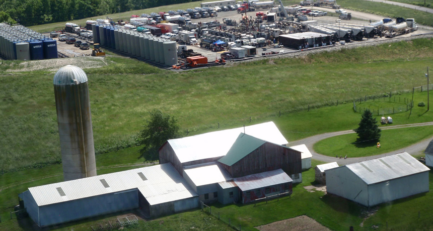 A hydraulic fracturing operation abuts a home and farm. A new study suggests that such proximity can, in some locations, cause contamination of drinking water wells.