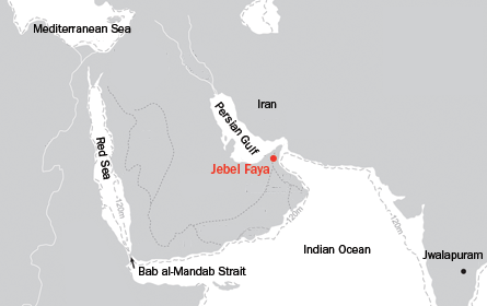 Jebel Faya sits just across the Persian Gulf from Iran, at another narrow water crossing where low sea levels would again have eased passage, Armitage says.