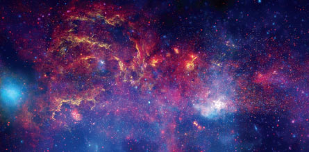 At the center lurks the Milky Way’s central black hole, also known as Sagittarius A* (pronounced “A-star”) because it lies in the constellation Sagittarius. Most galaxies have such a central black hole around which stars, gas and dust swirl as if going down a drain. Sagittarius A* is a heavyweight among black holes, coming in at around 4 million times the mass of the sun (although it is only about 15 times as wide). The black hole’s massive gravitational pull makes it a sort of Grand Central Station, where stars, gas and dust assemble in an urban galactic buzz.