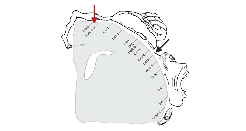 The brain area that controls neck muscles used to be between areas that control the thumb and the top of the head (black arrow) but a new study puts the neck between the shoulder and the trunk (red arrow).