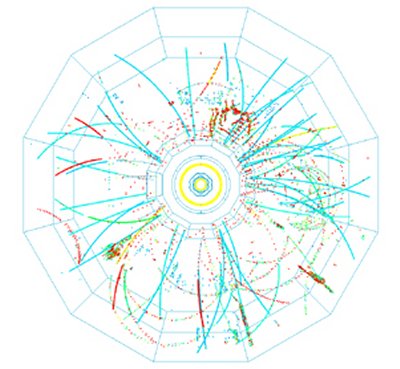 MATTER SPLATTER. A near-light-speed impact of a gold nucleus and a deuteron–the nucleus of the hydrogen isotope deuterium–spews subatomic particles whose trajectories appear as colored streaks on this diagram of a huge detector called STAR. |