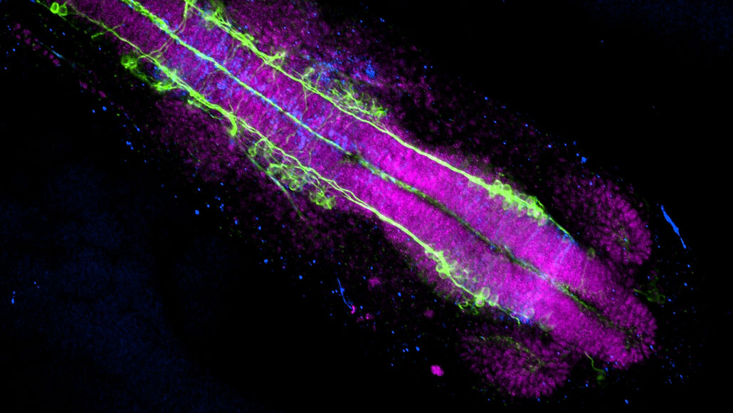 African turquoise killifish embryos put organ development on hold during a state of suspended growth called diapause. Organs like the brain, eyes and ears (pictured in a developmentally suspended embryo) enter diapause with multiple cell types, such as precursor nerve cells (pink), glial cells (blue) and mature nerve cells (green).