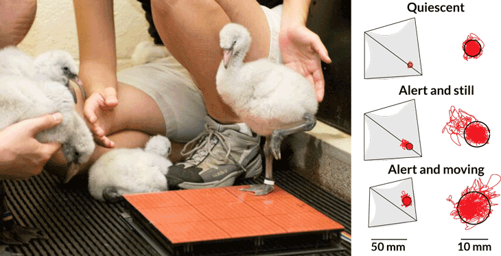 Ting and Young-Hui Chang of the Georgia Institute of Technology tested balance in fluffy young Chilean flamingos coaxed onto a platform attached to an instrument that measures how much they sway. Keepers at Zoo Atlanta hand-rearing the test subjects let researchers visit after feeding time in hopes of catching youngsters inclined toward a nap — on one leg on a machine. “Patience,” Ting says, was the key to any success in this experiment.