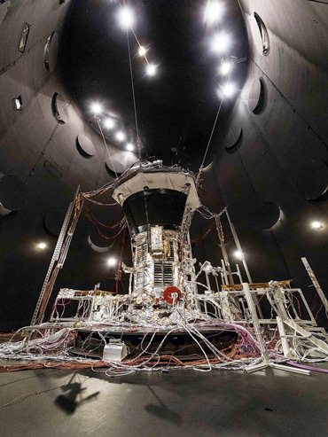 In January 2018, the entire spacecraft was lowered into a thermal vacuum chamber at NASA Goddard for two months of testing. The chamber, a cylinder standing 12 meters tall and 8 meters wide, was cooled to –190° C. A radiator glowing at about 315° C represented the heat coming from the back of the heat shield — but most of that heat never reached the scientific instruments since a titanium truss holds the heat shield at a safe distance from the spacecraft’s main body. The team cycled through hot and cold several times to simulate what Parker will experience.