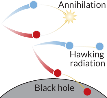 In one of the most significant realizations of his career, Hawking reported in 1974 that black holes emit a faint glow of particles. This effect arises from quantum mechanics, which states that a sea of transient particles and antiparticles pervades all of space. These “virtual” particles usually annihilate in an instant, but if one of those particles is lost inside a black hole’s boundary, or event horizon, its partner can escape, producing what’s now known as Hawking radiation (SN: 5/31/14, p. 16).