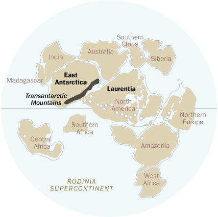 Finally, the researchers note, the ratios of various isotopes and elements in a basketball-sized chunk of granite found in East Antarctica — a chunk ripped by a glacier from bedrock now smothered by thick ice, the team speculates — match those of granite found only in what was southwestern Laurentia, which today is the American Southwest.