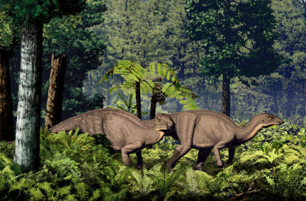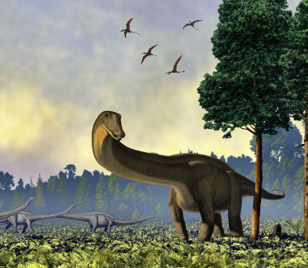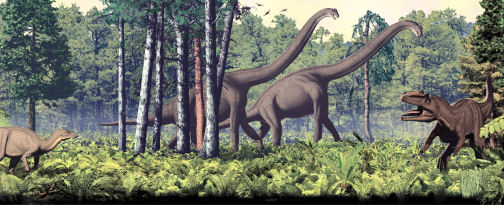 The mural is part of a 30-month, $36 million renovation and expansion of the museum’s dinosaur halls, says Matt Lamanna, assistant curator of vertebrate paleontology. Stars of the mural include the 82-ft-long Brachiosaurus and 30-ft-long Allosaurus (center and right in excerpt above). It also features a spike-tailed Stegosaurus, flying reptiles, and a chipmunk-size burrowing mammal called Fruitafossor ((SN: 4/30/05, p. 285). Remains of these creatures have been found in the Morrison formation, a set of strata found in a swath that stretches from Wyoming to New Mexico, says Lamanna. Fossils in those rocks chronicle life on a floodplain near an inland sea in an era long before the evolution of grasses and flowering plants. Philadelphia-based paleoartists Robert F. Walters and Tess Kissinger painted the Morrison mural and several others to be unveiled at the museum next week. “We’ve been working on this mural for 2 years,” says Walters. “The fact we’ve painted a record breaker is just starting to sink in.”