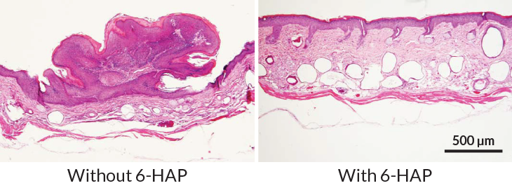 Gallo and colleagues found that the compound had an effect both when injected and when applied topically. Among mice injected with skin cancer cells, some received a shot of 6-HAP while others got a dummy shot. Tumors grew in all the mice, but the tumors in mice given the compound were about half the size of those in mice without the compound.
