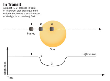 Nine years ago, Charbonneau, now at the Harvard-SmithsonianCenter for Astrophysics in Cambridge, Mass., and his then adviser, Tim Brown of the NationalCenter for Atmospheric Research’s High Altitude Observatory in Boulder, Colo., pioneered the transit method of hunting planets. The technique offers a key advantage over the wobble method, which reveals both transiting and nontransiting planets but provides only their minimum mass and the time it takes to orbit.