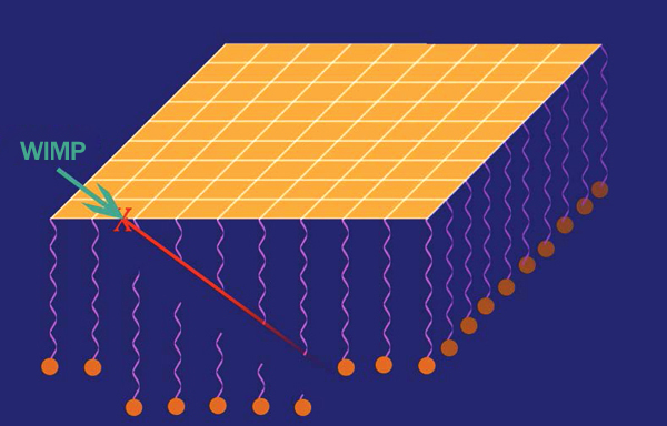 Freese and her colleagues’ proposed detector, which would be sensitive to these fluctuations, consists of a stack of thin gold sheets with single-stranded pieces of DNA hanging from them. When a WIMP smacked into the nucleus of a gold atom, the nucleus would whiz off, cutting through the DNA at specific locations in the strands.