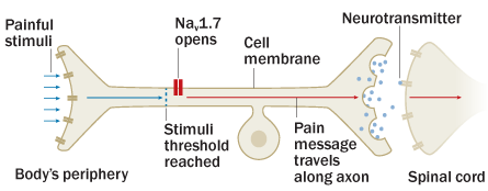 Besides their inability to feel pain, the Pakistani individuals studied by the scientists had something else in common: mutations in a gene called SCN9A. That gene encodes the instructions for a protein that forms a passageway for letting sodium ions into nerve cells. Known as Nav1.7, this particular ion channel sits on pain-sensing nerves; when a nerve is stimulated enough to warrant sending a signal to the brain, a flood of sodium ions rush into the cell.