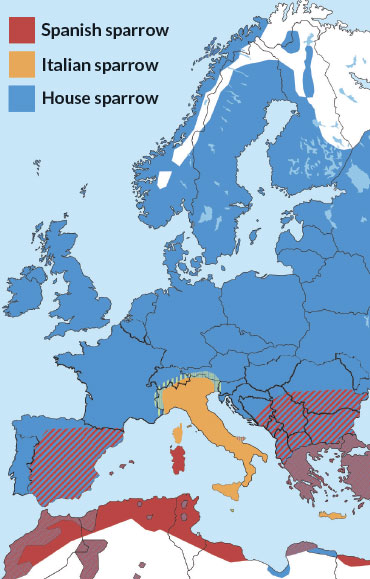 BLURRED LINES Italian sparrows, formed from interbreeding between house and Spanish sparrows, are a hybrid success story. Scientists are studying genetic changes that helped the Italian sparrows adapt to their environment and remain independent from their parent species.